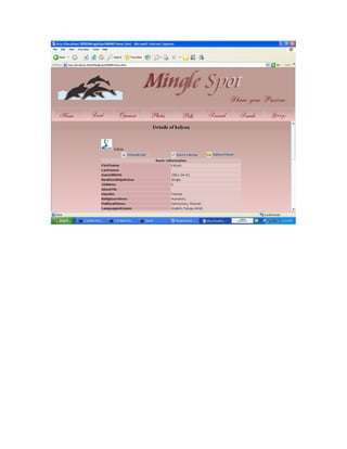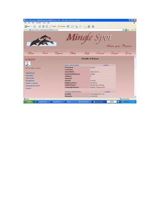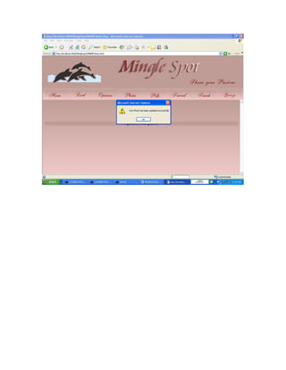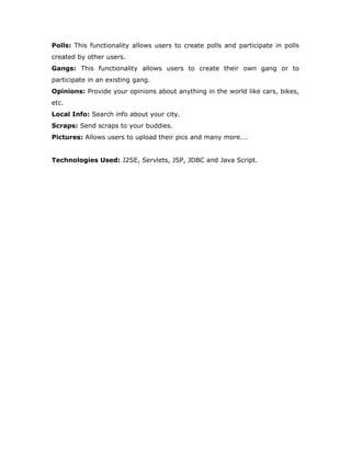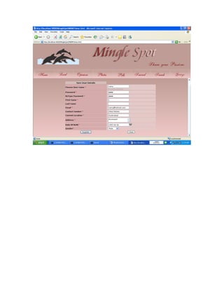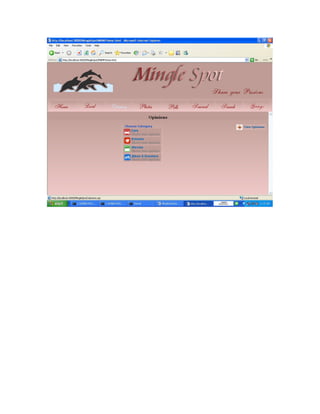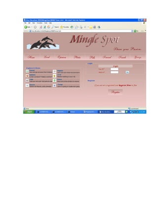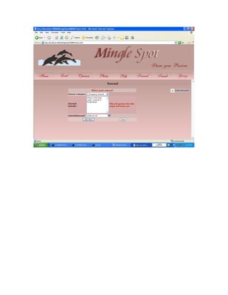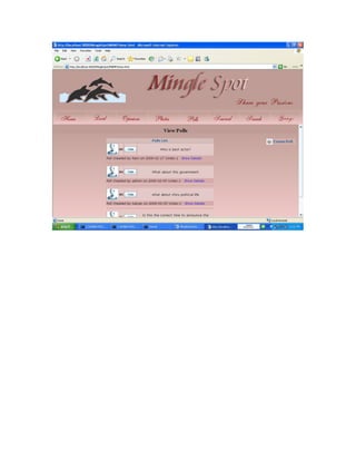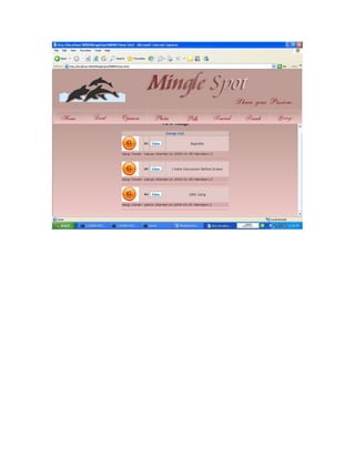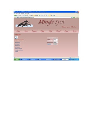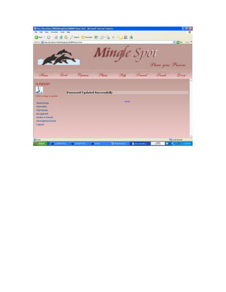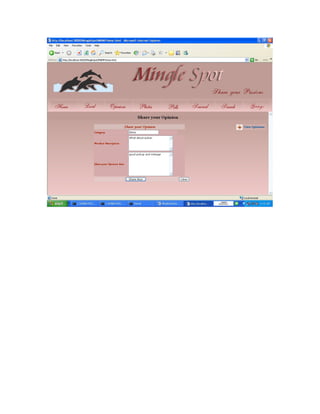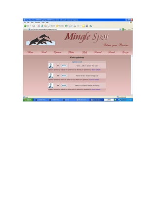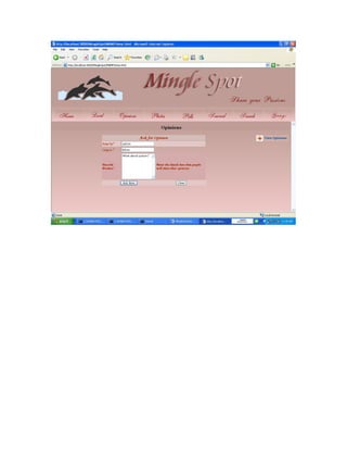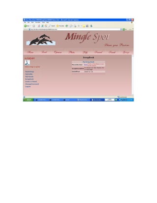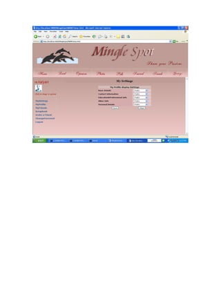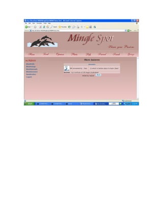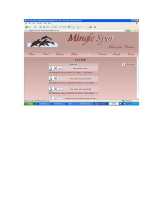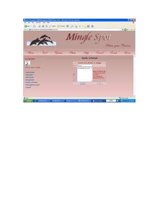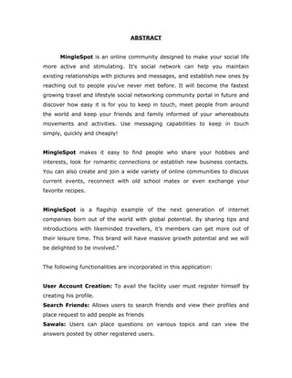 MingleSpot is a social networking website that allows users to connect with friends, search for people with shared interests, and join online communities. Key features include user profiles, searching for friends and adding them, asking and answering questions, creating and participating in polls, joining or creating interest groups, sharing opinions, finding local information, and sending messages to connections. The goal is to make it easy for users to stay connected with friends and family, meet new people, and grow their business networks. Technologies used include Java, servlets, JSP, and JavaScript.