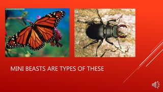 Mini beasts, or invertebrates, are animals without backbones or internal skeletons. They make up the most numerous type of animal in the world, with over 25,000 species found in Britain alone. Unlike vertebrates which have backbones, invertebrates have soft, bendy bodies and many have hard shells or exoskeletons covering their bodies to provide protection. Examples given are insects and spiders, which have thin, strong exoskeletons that allow them to move more quickly than other mini beasts.