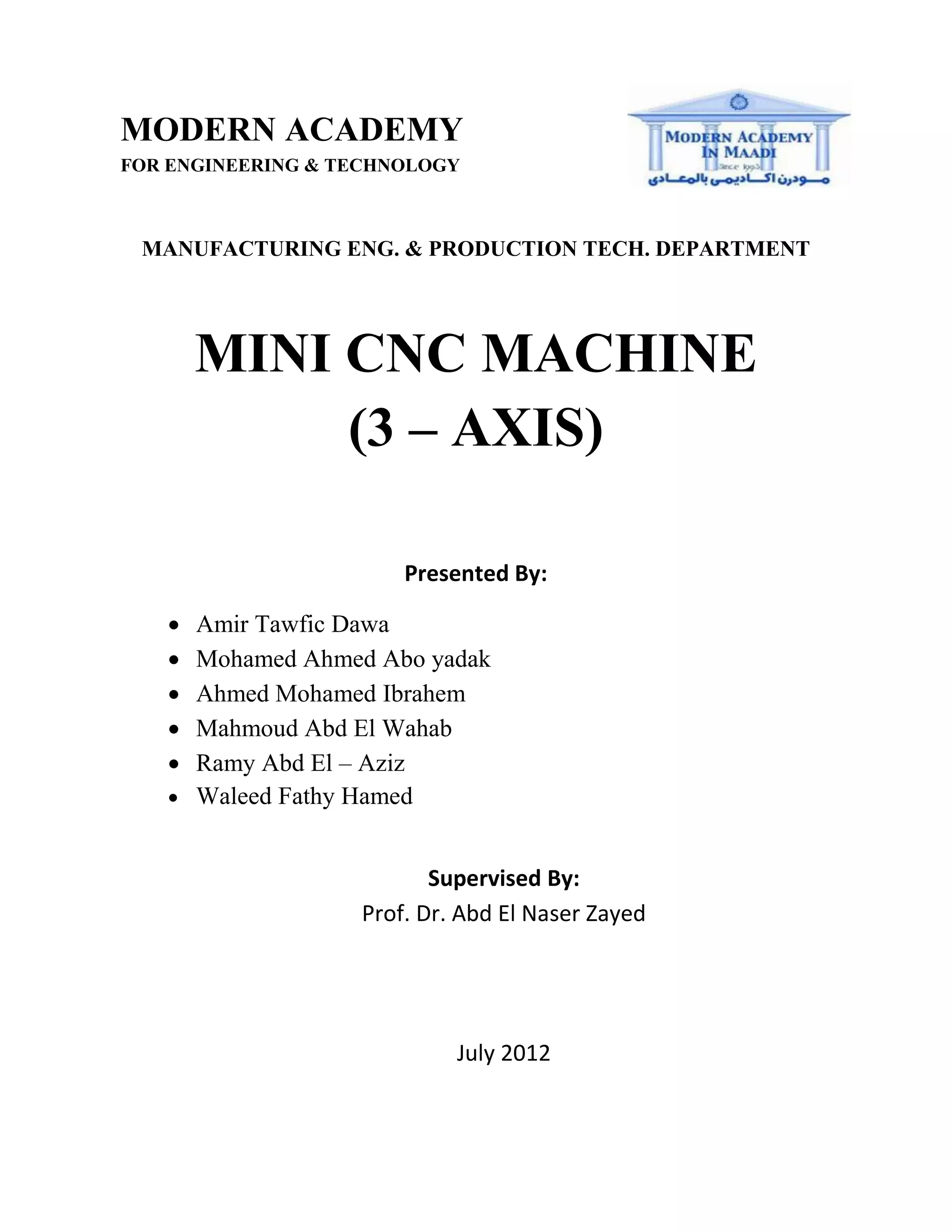 The document outlines the design, manufacturing, and assembly of a mini CNC machine (3-axis), detailing its components, control systems, design principles, and machining processes. It covers key topics such as CNC system elements, CAD/CAM integration, advantages and limitations of CNC technology, and experimental verification of machined parts. The project aims to enhance accuracy and efficiency in manufacturing processes through optimized end milling and effective controller designs.