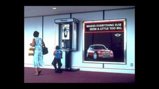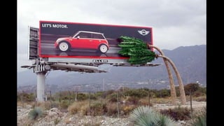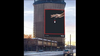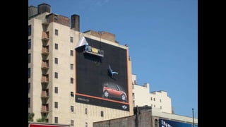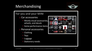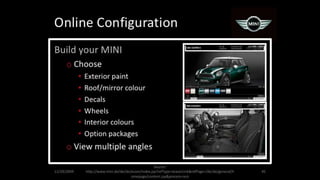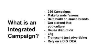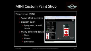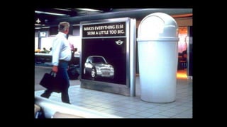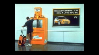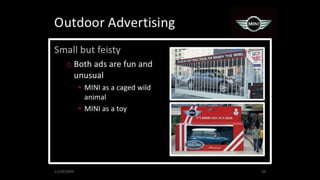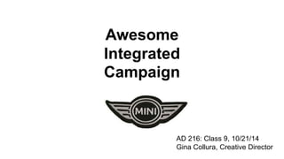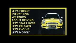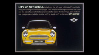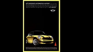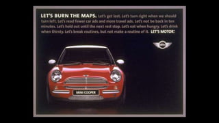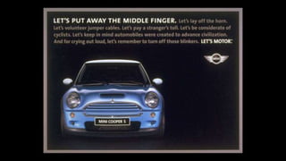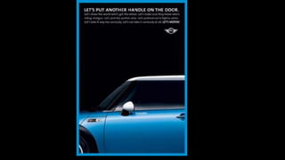 The document describes an integrated marketing campaign created by Crispin Porter Bogusky for the Mini Cooper automobile brand. The campaign's big idea was "Let's Motor" and it aimed to reintroduce the Mini Cooper brand to the US market in a unique, non-traditional way. Rather than traditional advertising, the campaign focused on magazine placements, outdoor advertising, and the brand's website. It used bold, minimalist design and portrayed the brand in a fun, cheeky voice. The campaign included sticker cards, a roof design generator on the website, and small print ads to bring the big idea to life across multiple channels. The goal was to make Mini a cultural icon and attract influential early adopters.