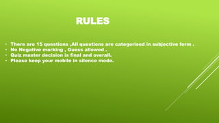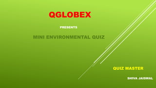 This document provides the questions and answers for a mini environmental quiz hosted by Shiva Jaiswal. It includes 15 multiple choice questions about topics like Earth Day, endangered species, national parks, and environmental organizations. The rules are that there is no negative marking, the quiz master's decision is final, and participants should silence their mobile devices.