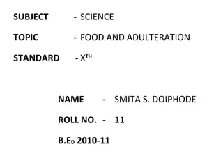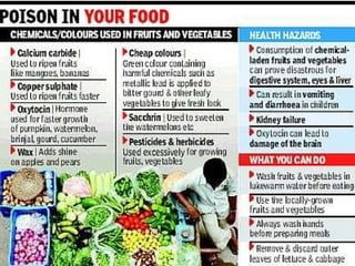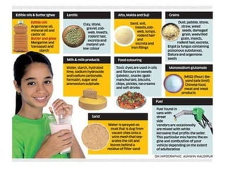 Food is essential as it provides energy for life processes through elements like nitrogen, oxygen, and hydrogen. Adulteration is reducing purity by adding foreign substances intentionally or unintentionally. Common intentional adulterants include adding chalk to flour to make it appear whiter, water to milk to increase volume, and colors to disguise poor quality. Unintentional adulterants can be pesticides and chemicals from food processing and packaging.
