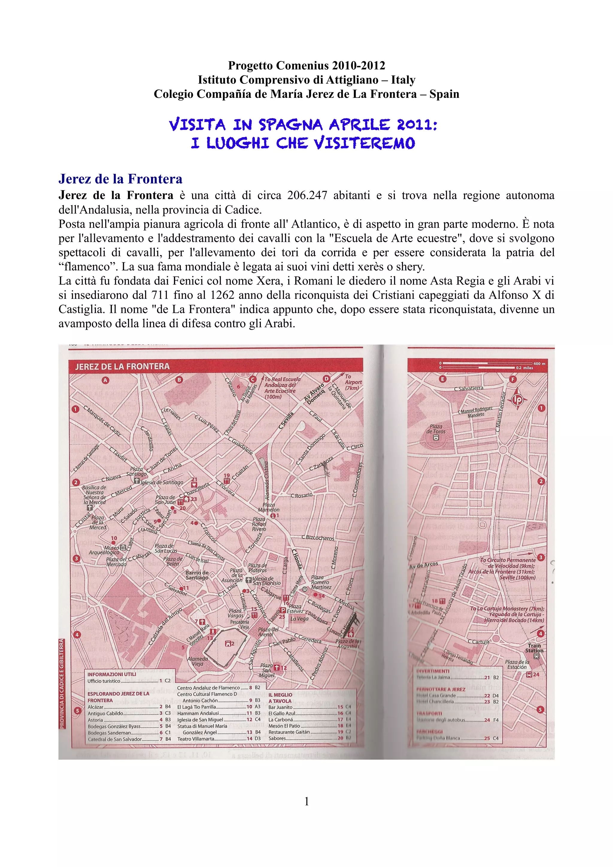Il progetto Comenius 2010-2012 dell'Istituto Comprensivo di Attigliano include una visita a Jerez de la Frontera e Siviglia, in Spagna. Jerez è nota per la sua cultura del vino e dell'arte equina, mentre Siviglia è un importante centro culturale, artistico e storico con monumenti riconosciuti dall'UNESCO. Entrambe le città offrono una ricca esperienza turistica, con luoghi significativi da visitare come cattedrali, alcázar e musei.