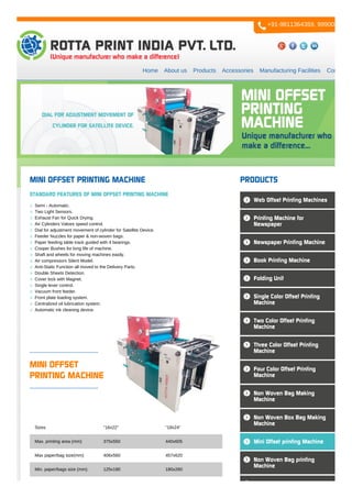 This document provides information about mini offset printing machines, including technical specifications for two sizes of machines. Key details include: