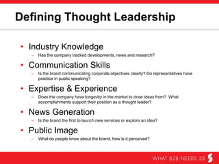 The document discusses thought leadership strategies for building credibility and branding. It defines thought leadership as demonstrating industry knowledge, communication skills, expertise, experience, and being a news generator. The goals of thought leadership are to generate brand awareness, demonstrate vision and drive, build a positive reputation, and emphasize knowledge and credibility. It recommends educating the industry, defining constituents, contributing to conversations, and leading by example as thought leadership strategies.