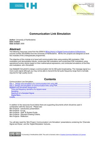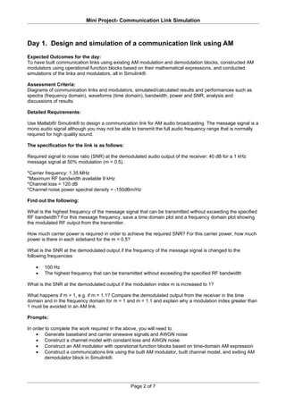The document describes a simulation project for a communication link using AM and PSK modulation. Students are asked to design and simulate a communication link using AM modulation to transmit an audio signal, investigating the effects of different message signal frequencies and modulation indices. They also simulate communication links using BPSK and QPSK modulation schemes, comparing the performance of each in terms of bandwidth efficiency and required signal power. The project uses Matlab and Simulink to generate signals, design modulators and demodulators, and simulate the overall communication links.