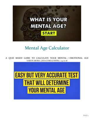 This document describes a mental age calculator project created in Java using Swing. It includes 10 multiple choice questions to calculate the user's mental age based on their responses. The program displays the questions and answer options in a graphical user interface, tracks the user's score, and provides a comment analyzing their mental age based on their final score. It was created by Varun as a student project at Guru Jambheshwar University of Science and Technology.