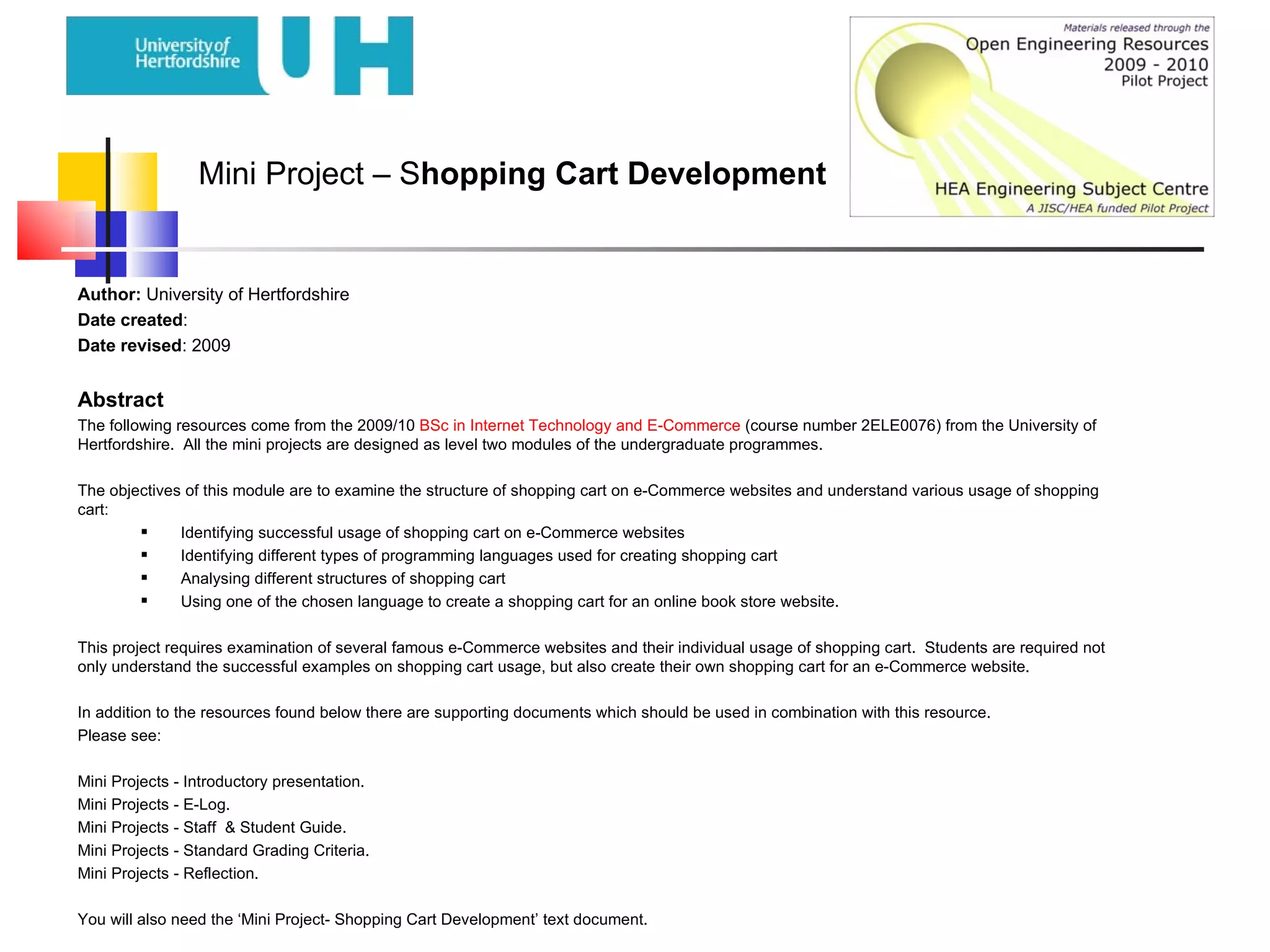The document outlines a mini project focused on shopping cart development as part of a university module in internet technology and e-commerce. It aims to teach students about the structure, usage, and programming languages associated with shopping carts on e-commerce sites, culminating in the creation of their own shopping cart for an online bookstore. Additional resources and supporting documents are provided to aid in the project's execution.