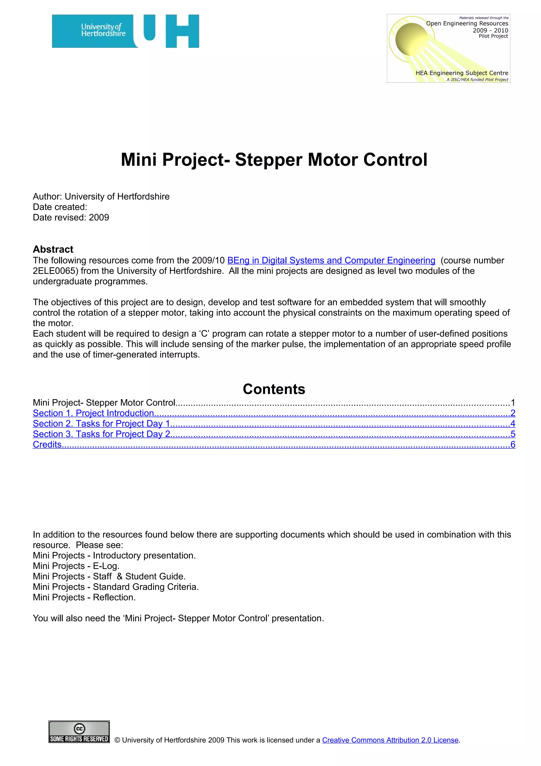 This document outlines a mini project for students to design software to control a stepper motor. The objectives are to design software that smoothly rotates the motor to specified positions while considering its maximum operating speed. Over two days, students will create programs to move the motor to positions using delays and then interrupts, and investigate how load affects the motor's maximum rotation speed. They will implement a speed profile to move the motor as quickly as possible.