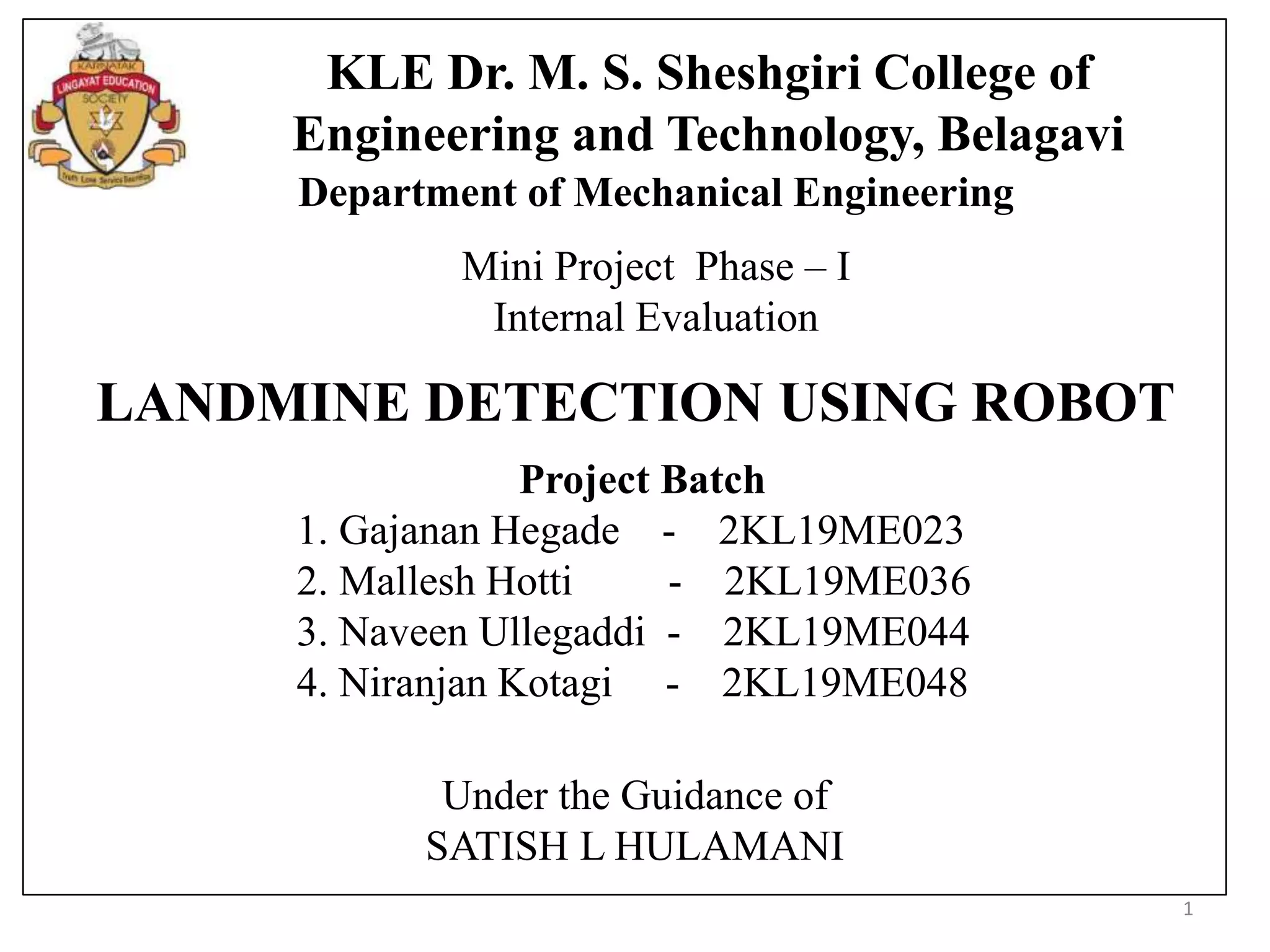 This document summarizes a student project to design a robot for landmine detection. It outlines the problem of landmines remaining after warfare endangering civilians. The robot uses a rocker-bogie mechanism to move over uneven ground and metal detector sensors to identify landmines, alerting operators with a buzzer. So far, students have researched these technologies and built a six-wheeled robot frame with the goal of integrating remote control, sensors, and detection systems to create an autonomous landmine detection robot.