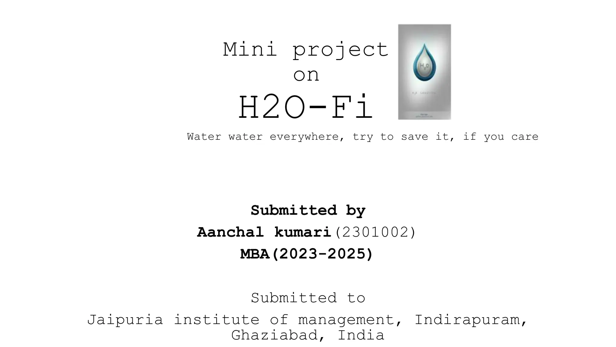This document provides a proposal for a new water purification machine called H2O-Fi that produces three types of water - mineral water, alkaline water, and distilled water from wastewater. It would use reverse osmosis to produce mineral water and an electrolysis process to produce alkaline water. Distilled water would be produced from wastewater beneath the tap. The proposal includes visions, objectives, product details, SWOT analysis, competitive analysis, and plans for marketing, operations, finances, and human resources. The goal is to develop a sustainable product that saves water and provides multiple health benefits to users.