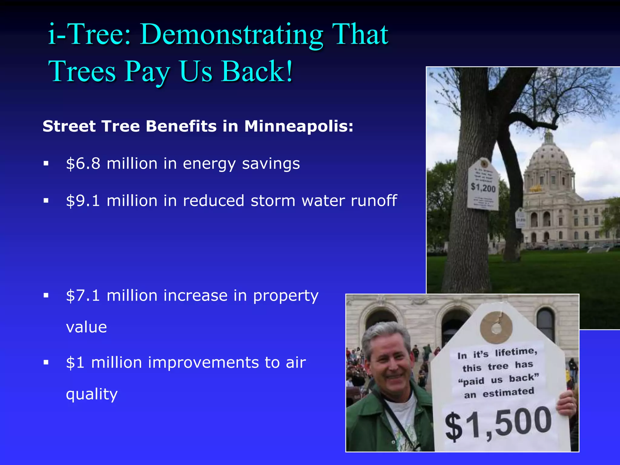 - The i-Tree software developed by the US Forest Service to determine the environmental services provided by trees like carbon sequestration, stormwater management, and increased property values. Case studies show trees in Minneapolis providing over $23 million in benefits annually.