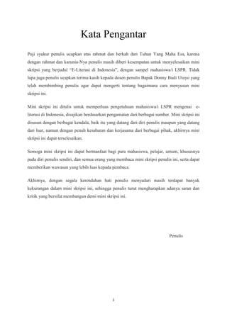 Mini skripsi ini membahas tentang e-literasi di Indonesia dengan fokus pada mahasiswa/i LSPR, termasuk pengertian, kondisi, dan strategi peningkatannya. Penelitian menunjukkan bahwa meskipun mahasiswa sering menggunakan teknologi untuk mencari informasi, mereka masih kurang menyadari pentingnya e-literasi dan terdapat kesenjangan digital di masyarakat. Hasil survei menunjukkan kebutuhan akan bimbingan e-literasi untuk meningkatkan kualitas penggunaan informasi dalam kehidupan sehari-hari.