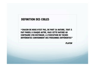 The document defines targets as functions within a sector and discusses defining targets. It provides quotes from Plato about how people are different in nature and suited for different tasks. It lists website sources for results from tests and information about functions within a group from different websites.