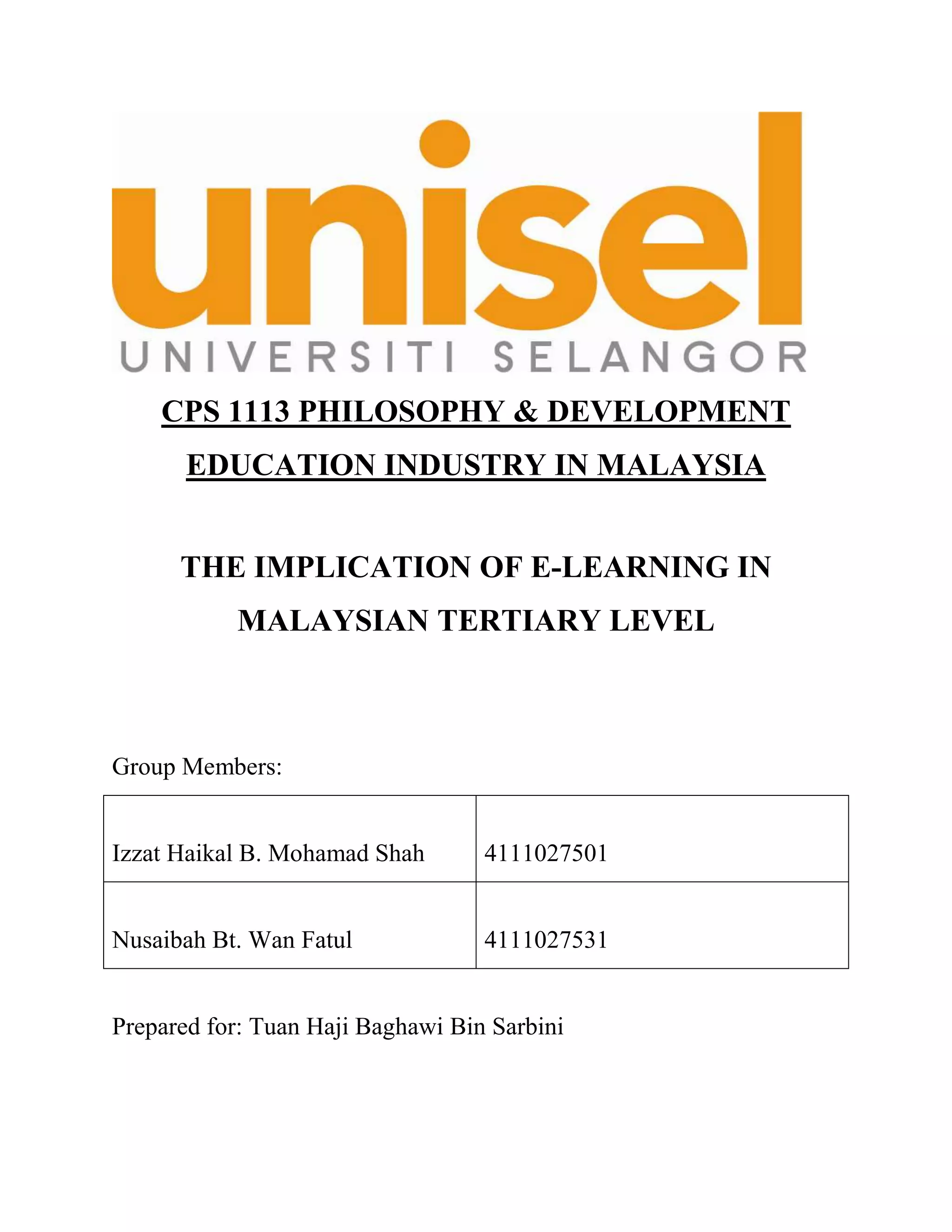 This document discusses a study on the implications of e-learning in Malaysian tertiary education. It begins with an introduction and background to e-learning and its increasing role in education. The study used questionnaires distributed to 50 students and interviews with lecturers and IT professionals at Universiti Kebangsaan Malaysia to understand perceptions of e-learning and challenges to adoption. Key findings indicated that students have positive views of e-learning and Internet access, but infrastructure, changing teaching culture, and lack of skills were challenges faced. The study concludes that e-learning acceptance requires collective effort from students, lecturers, and management with appropriate technology and support.
