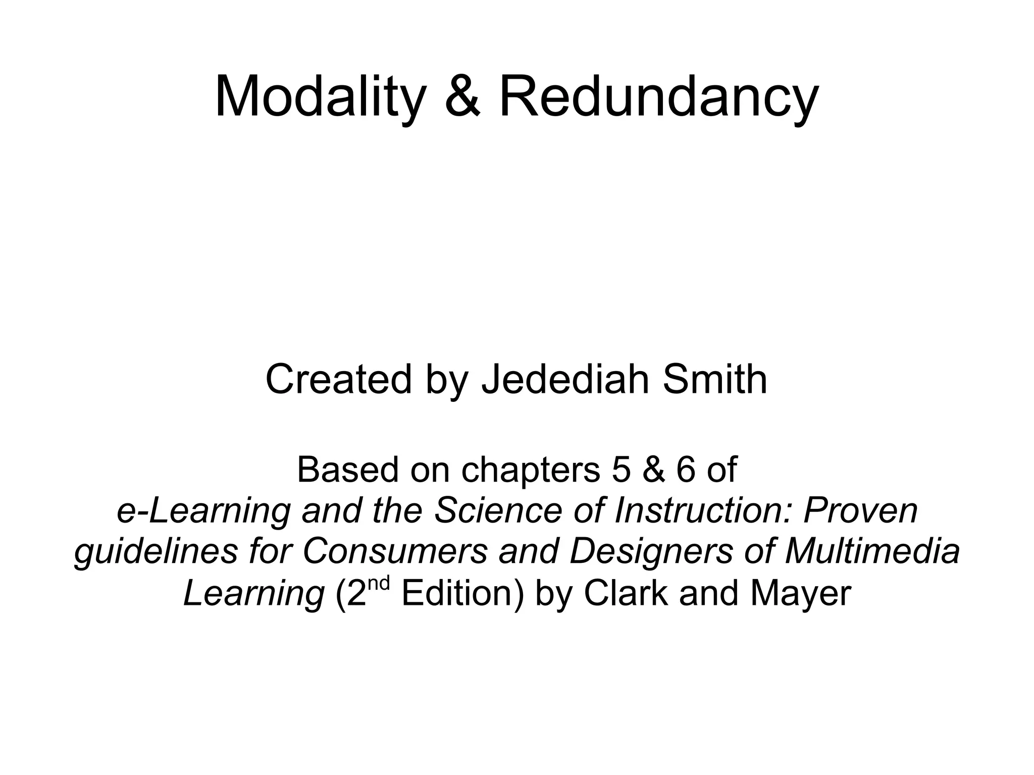 The document discusses the modality and redundancy principles for multimedia learning. The modality principle states that students learn better from words and pictures rather than from words alone. Presenting words as speech is better than presenting them as text. The redundancy principle states that students do not learn better from both words and pictures than from words alone if the words are redundant. The assessment questions test application of these principles by asking which option correctly applies the modality principle of spoken vs printed words and which correctly applies the redundancy principle of spoken and printed vs spoken alone.