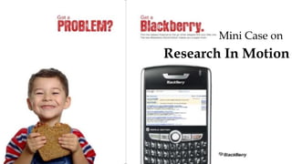 RIM was launched in 1997 and developed the Blackberry smartphone, known for its security and availability across networks. It saw early success but lost market share as competitors copied its concepts and expanded offerings. While RIM tried innovations, they failed to appeal widely. The document suggests RIM should refocus on business phones and better manage the ideation and development process through techniques like mind mapping to regain leadership.