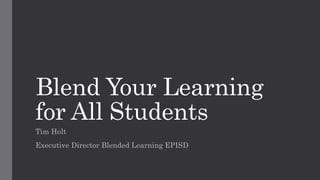 This document discusses blended learning and its benefits for gifted students. Blended learning combines traditional in-person instruction with online learning, allowing students to learn in part at a school and in part through online delivery with some control over pace and place. It describes six models of blended learning and suggests the flex model, where material is primarily online and students learn independently with teacher support, best serves gifted students by allowing a personalized, rigorous curriculum tailored to their needs and pace.