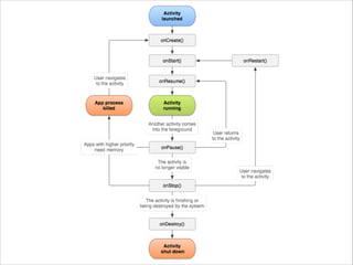 This document provides an agenda and overview for a 4 hour hands-on workshop on Android development. The agenda covers setting up the development environment, creating a basic "Hello World" app, and building a simple to-do list app to demonstrate core Android concepts like activities, intents, extras, and preferences. The document explains the overall Android architecture and development process using Eclipse, virtual devices, building UI with layouts, and logging with Logcat.