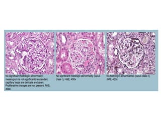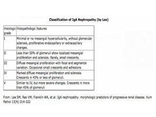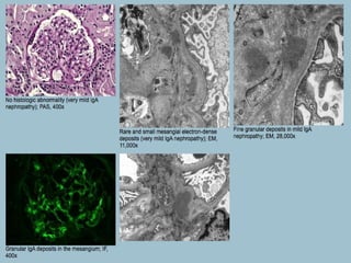 2. IgA nephropathy shows normal or minimally expanded glomeruli and mesangium on light microscopy. Immunofluorescence shows dominant mesangial IgA with C3 deposits. Electron microscopy shows normal epithelial cells and mesangial deposits.