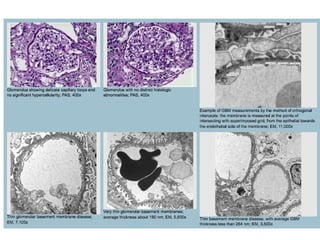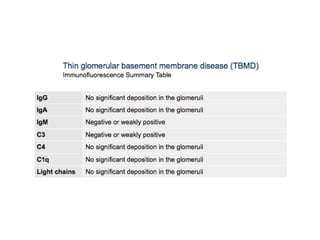 The document summarizes the light microscopic, immunofluorescence, and electron microscopic findings for several different kidney diseases: