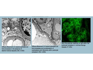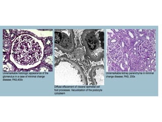 1. Minimal change disease shows normal or mildly expanded glomeruli and mesangium on light microscopy. Immunofluorescence may show fine IgG deposits in podocytes. Electron microscopy shows diffuse foot process effacement without deposits.