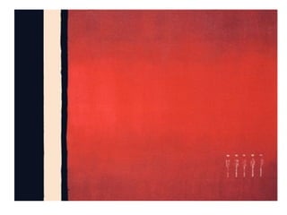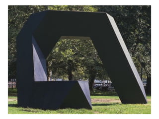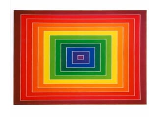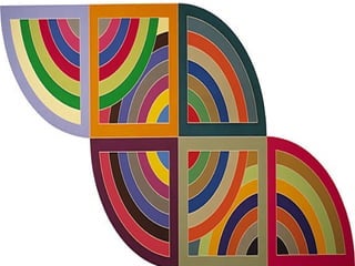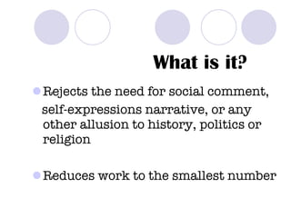 Minimalism rejects elements like symbolism, narrative, history, and self-expression, focusing instead on reducing art to its basic geometric forms and solid colors. It opposed the complexity of abstract expressionism, aiming to present only what was literally there without hidden meanings. Minimalist art is characterized by precise shapes, repetitive patterns, solid colors, and an emphasis on the materials themselves over personal expression. While some saw it as too simplistic, minimalism influenced artists like Frank Stella and Ellsworth Kelly to create geometric and three-dimensional works based on everyday objects and spaces.