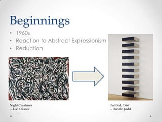 Minimalism emerged in the 1960s as a reaction to Abstract Expressionism. Minimalist artists aimed to eliminate emotion, allusion, and meaning from their work by creating simple geometric objects and structures. Key minimalist artists included Frank Stella, Donald Judd, Carl Andre, Sol LeWitt, Robert Morris, and Dan Flavin. Their work used basic forms and industrial materials to focus attention on the objects themselves rather than on symbolism or expression.