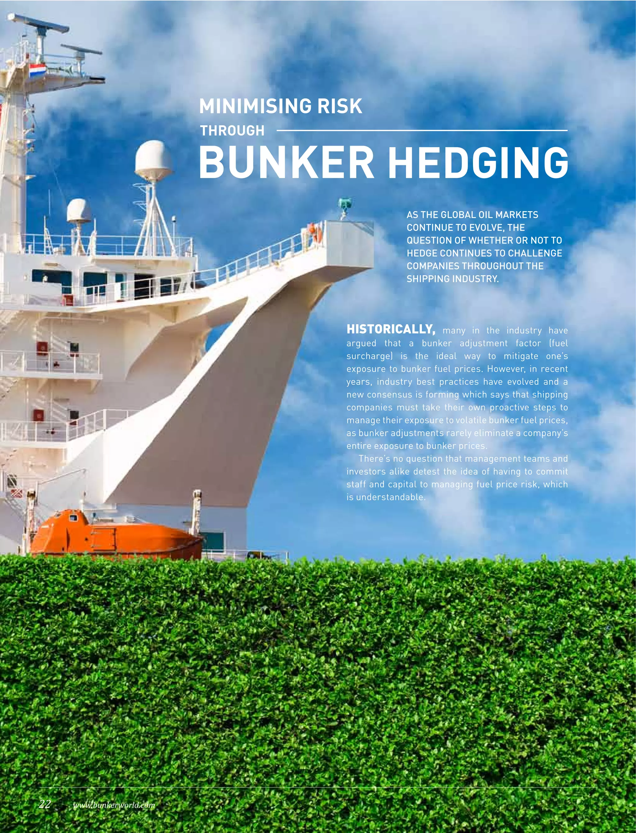 The document discusses the evolution of bunker fuel hedging in the shipping industry, emphasizing the need for companies to actively manage their exposure to volatile bunker fuel prices rather than solely relying on bunker adjustments. It highlights the importance of developing a comprehensive hedging program that considers a company's risk tolerance and objectives, while avoiding common mistakes such as treating hedging as a profit-generating venture. The necessity of engaging experts in hedge management is also stressed to avoid the pitfalls of inadequate or non-existent hedging policies.