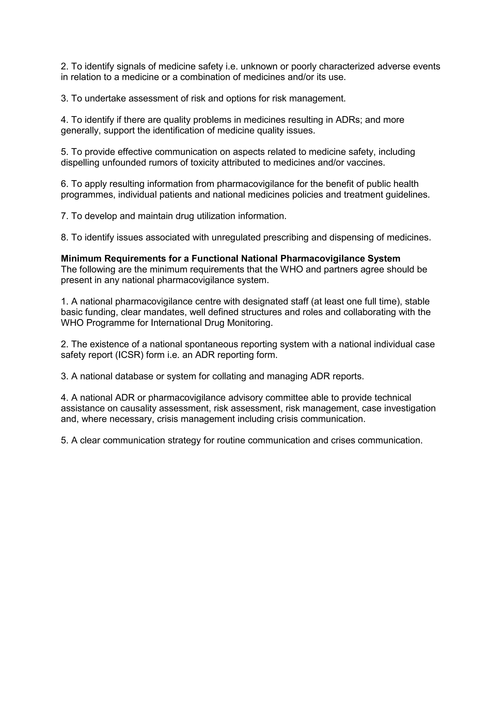 The document outlines minimum requirements for a functional national pharmacovigilance system. It defines pharmacovigilance and describes the development of minimum requirements through consultation with experts. The minimum requirements include: having a national pharmacovigilance center with dedicated staff and funding; a national system for spontaneous reporting of adverse drug reactions using a standard form; a national database for managing reports; a national advisory committee to provide technical assistance on assessing and managing risks; and a communication strategy for routine updates and crisis response.