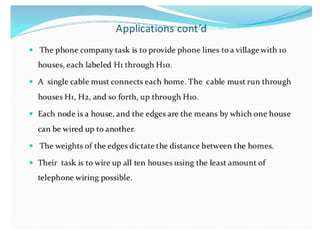 The document discusses the concept of Minimum Spanning Trees (MST) in graph theory, specifically detailing Kruskal's and Prim's algorithms used to find MSTs. It explains that an MST is a spanning tree that connects all vertices in a graph with the minimum total edge weight. The document outlines the steps of Kruskal's algorithm, focusing on connecting nodes while avoiding cycles to achieve the minimum weight spanning tree.