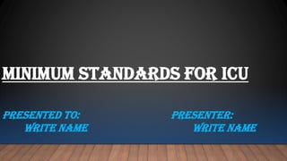 The document outlines minimum standards for Intensive Care Units (ICUs), detailing staffing, operation, structure, equipment, and patient management. It explains the different levels of ICUs (level 1, 2, and 3) with varying workloads and required equipment, emphasizing the necessity for up-to-date monitoring and protocols. The document also highlights essential ICU components such as medical staff, patient areas, and the types of equipment utilized.