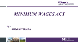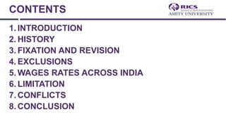 The Minimum Wages Act of 1948 aims to set minimum wages for skilled and unskilled laborers in India based on a living wage standard. It outlines the history of minimum wage legislation in India from 1920 onwards and recommendations to establish wage boards. Minimum wages are revised every 5 years based on a cost of living index and differ across states, sectors, skills and occupations. While the Act aims to protect workers, there are limitations such as unemployment, inflation, exemptions and lack of awareness. There have been conflicts between central and state governments over fixing wages for programs like MGNREGA relative to state-level minimum wages.