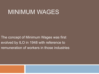 The document discusses various Indian labor laws regarding minimum wages, bonus payments, provident funds, gratuity, and leave policies. It provides details on: