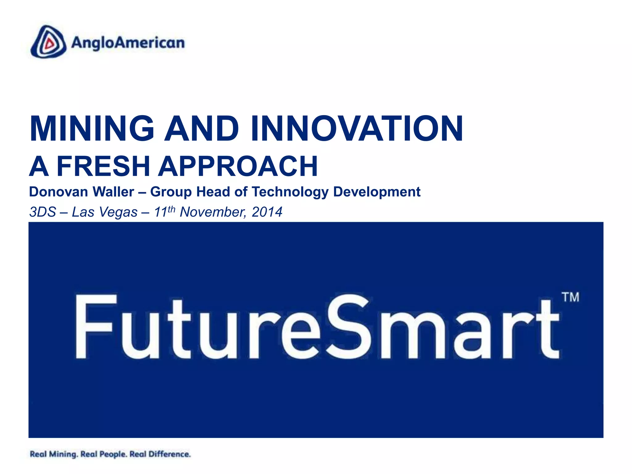 This document outlines a presentation by Donovan Waller on innovative approaches to mining, highlighting the need for radical transformation in the industry due to lagging R&D and productivity. It introduces the FuturesmartTM initiative, which aims to create sustainable mining practices through technology and collaborative efforts among stakeholders. The document also discusses open forums designed to integrate diverse perspectives, fostering innovation in mining, processing, and sustainability.