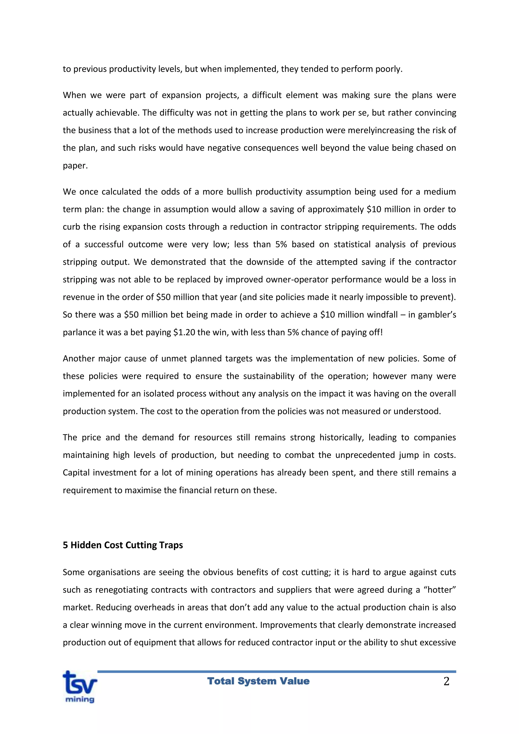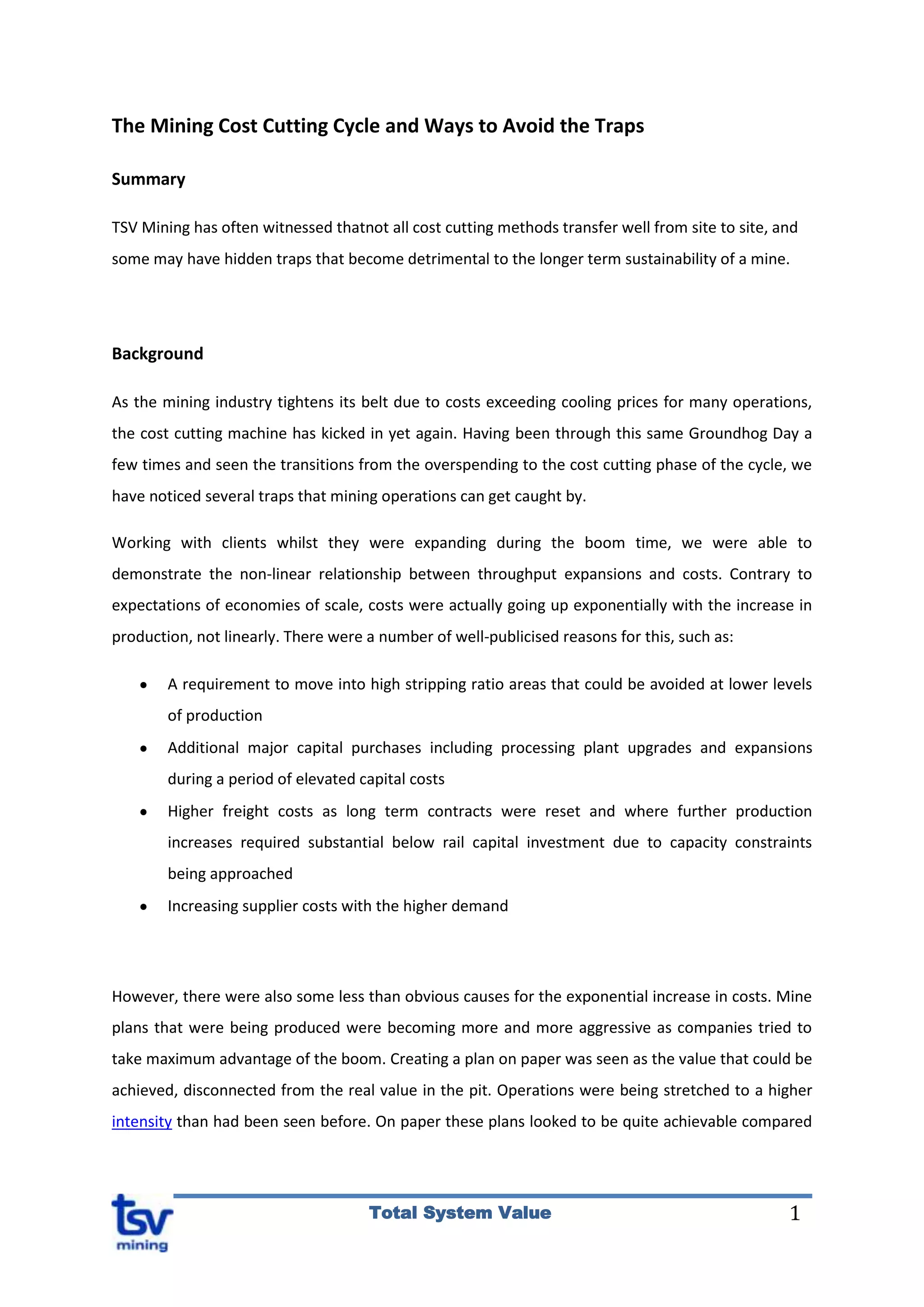 The document discusses the challenges and hidden traps that mining operations face when implementing cost-cutting measures amid rising costs. It emphasizes the importance of understanding the non-linear relationship between production and costs, the risks associated with aggressive mine planning, and the detrimental impacts of reducing inventories without a comprehensive risk assessment. It suggests sustainable cost-cutting strategies such as renegotiating contracts, analyzing the effects of process improvements on the overall system, and managing variation in operations to enhance productivity and reduce unnecessary expenses.