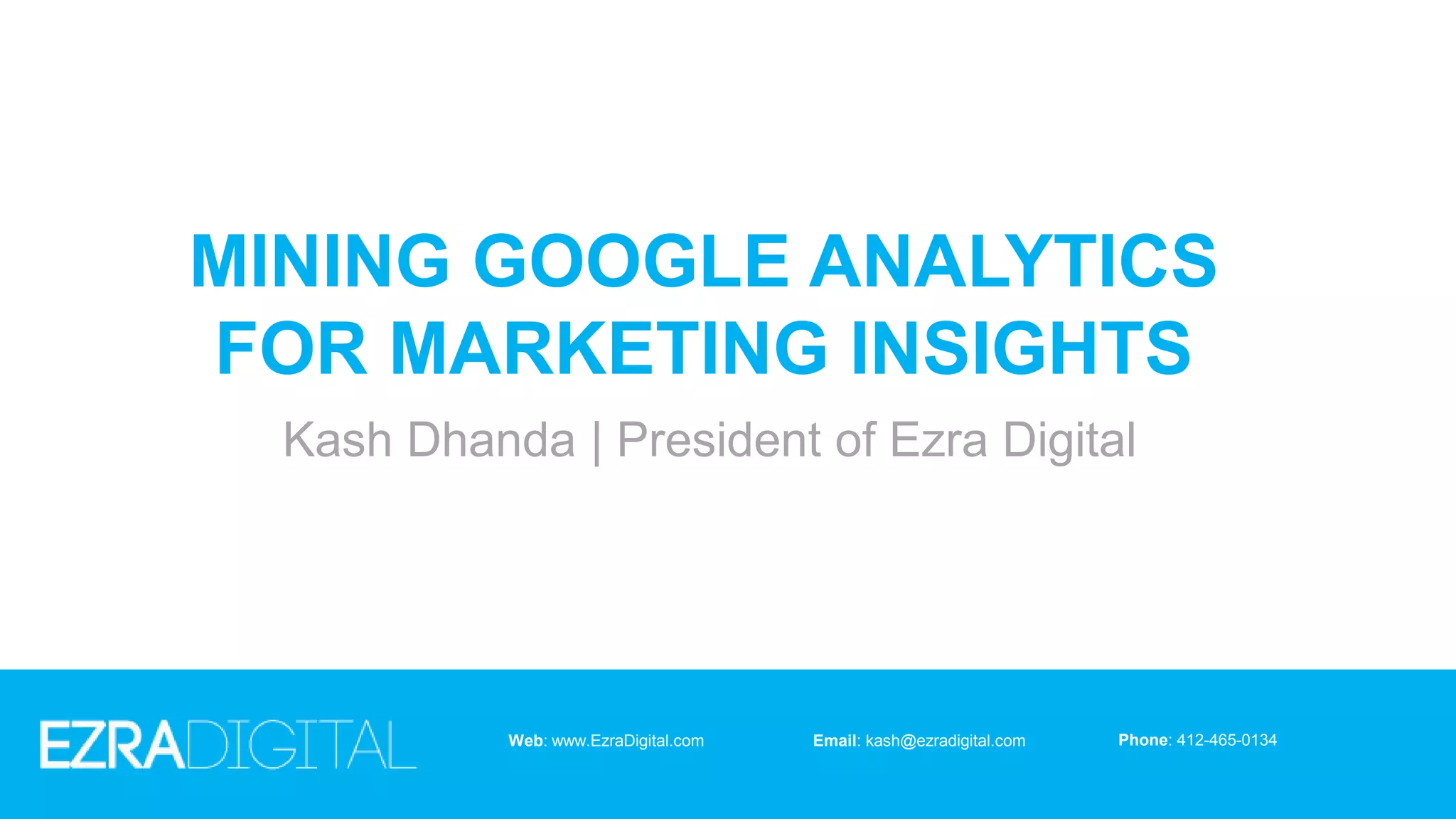 This document discusses how to mine Google Analytics for marketing insights. It begins with an introduction to why Google Analytics is useful, including that it is fully featured, has a large community, is from Google, and is free. It then covers properly setting up a Google Analytics account, defining web objectives and goals, generating insights from the data, and best practices for analysis. Setting up the account correctly, determining objectives, and asking the right questions of the data are emphasized as keys to obtaining useful insights from Google Analytics.