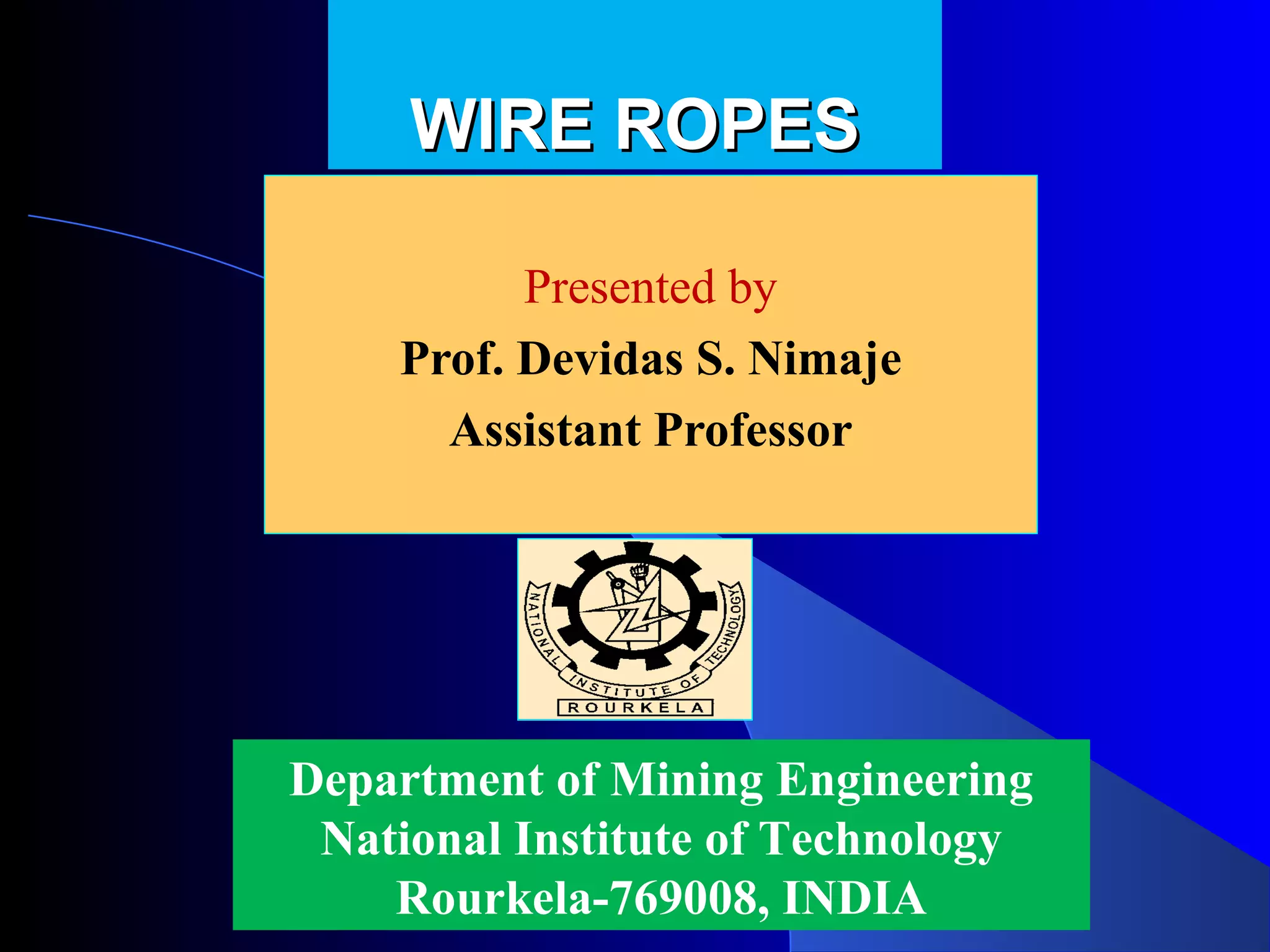 This document summarizes different types of wire ropes used in mining. It discusses the materials, construction, and properties of various wire ropes including stranded ropes, non-stranded locked coil ropes, and flat ropes. The key types are distinguished by their core, wire thickness, number of wires, and lay pattern. Appropriate wire rope selection depends on factors like flexibility, strength, and whether it will be used for standing or running applications.