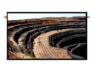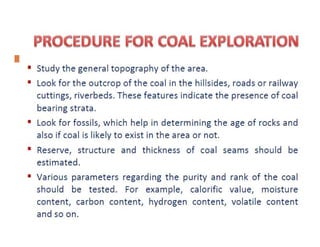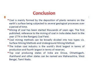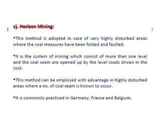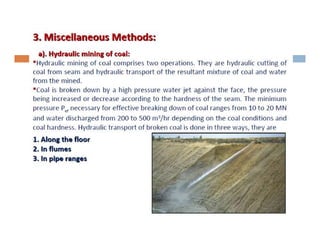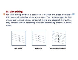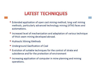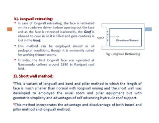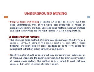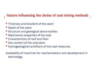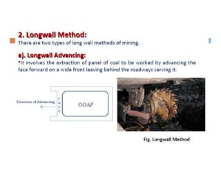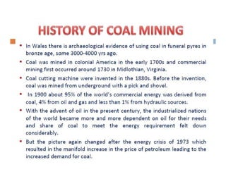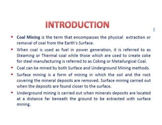 This document discusses coal mining methods, including their advantages and disadvantages. It describes surface mining methods like opencast mining and underground mining techniques. Surface mining is cheaper but has disadvantages like disturbing overburden and creating unstable spoil tips. Underground mining can access deeper seams but is more expensive, inflexible, and dangerous due to risks of gas, dust, fires and roof collapses. The document also outlines the history of coal mining and various techniques used over time.