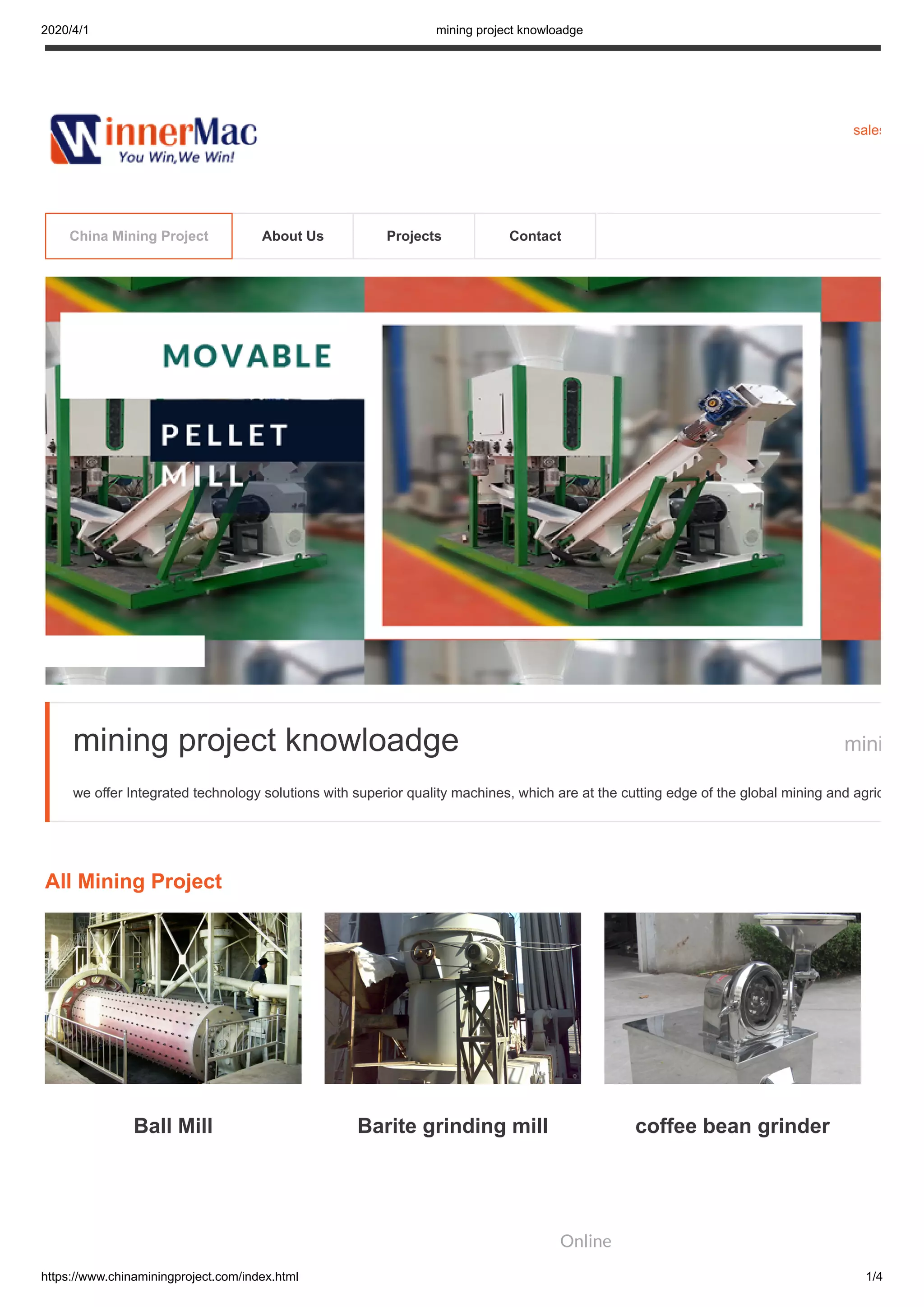 The document is a multi-page website for a Chinese mining project equipment manufacturer. It provides information on their various mining machines and grinding equipment, including ball mills, barite grinding mills, gypsum grinding mills, and others. It also lists recent and popular projects, as well as details on the company location in Zhengzhou, Henan Province, China. The company offers integrated technology solutions and machinery for mining and agricultural industries.