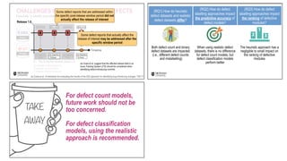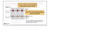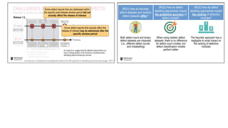 The document discusses analytical models for predicting software defects and the challenges of mining software defects, particularly focusing on the definition and identification of post-release defects. It emphasizes the importance of data extraction from issue tracking systems and version control repositories to effectively analyze software quality and provide insights for managerial decision-making. Additionally, it contrasts heuristic and realistic approaches to defect labeling, highlighting the impact on predictive accuracy and ranking of defective modules.
