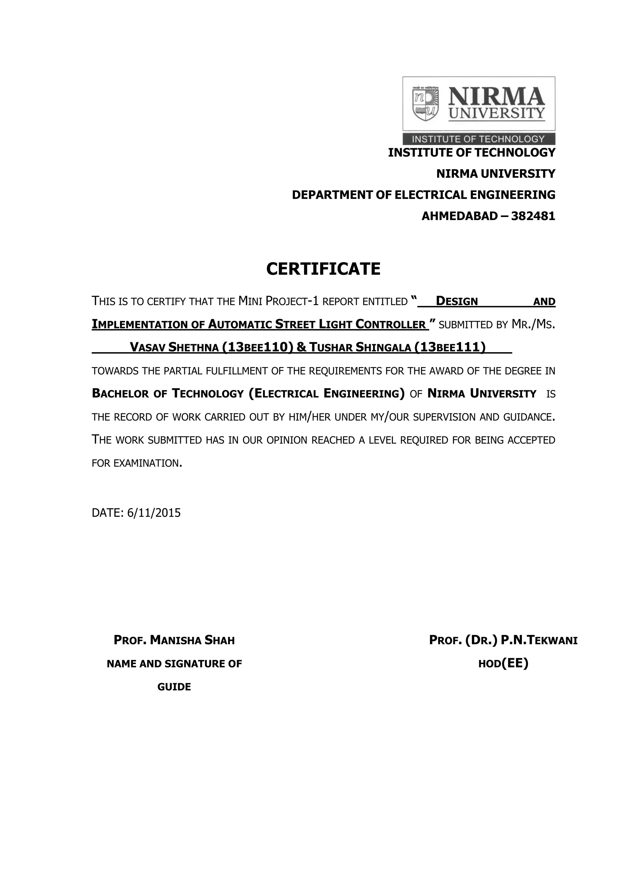This document describes a student project to design and implement an automatic street light controller. It aims to save electricity by detecting vehicles and only turning street lights on fully when a vehicle is present. The project uses light dependent resistors, a power supply, relays, timers, and infrared sensors. It discusses the circuit designs and components in detail across multiple chapters. The conclusion states that automatic street lighting can significantly reduce energy consumption compared to manual control.