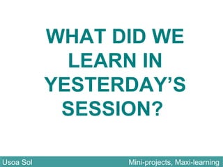The document outlines a series of mini-projects designed for ESL classrooms, focusing on the use of rubrics, project presentations, and Web 2.0 tools like wikis and Voki avatars. It emphasizes developing students' key competencies and engagement through personalized, technically simple activities that cater to various learning levels. The course aimed to provide teachers with resources and strategies to implement these projects effectively in their classrooms.