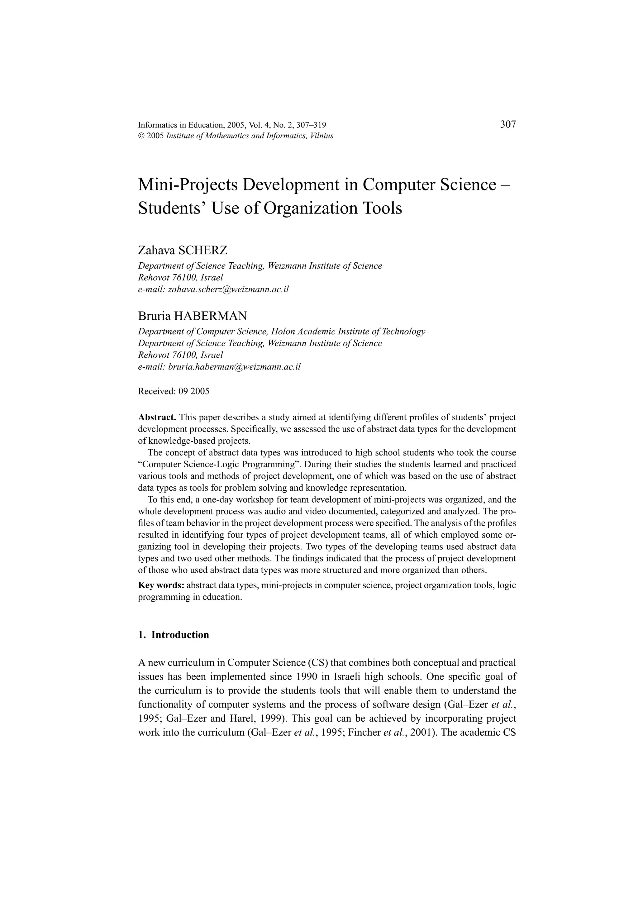 The document describes a study on the development processes of computer science mini-projects by high school students, focusing on their use of abstract data types (ADTs) as organizational tools. A workshop was conducted where teams developed knowledge-based projects, and the analysis identified four distinct types of project development teams based on their strategies, organization, and use of ADTs. Findings suggested that teams utilizing ADTs followed a more structured and organized development process compared to those using other methods.