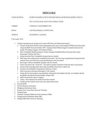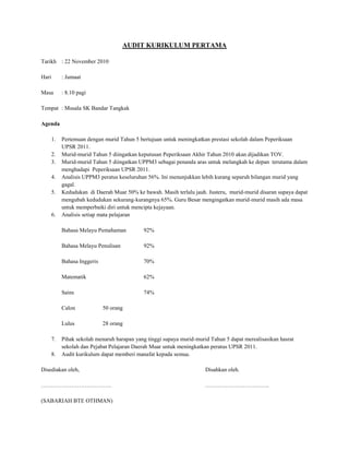 Dokumen ini membincangkan audit kurikulum untuk meningkatkan prestasi murid tahun 5 dalam peperiksaan UPSR 2011, dengan analisis menunjukkan peratus kelulusan yang rendah dan saranan untuk memperbaikinya. Selain itu, terdapat kursus untuk guru tentang Kurikulum Standard Sekolah Rendah (KSSR) dan pengajaran sains, menekankan dokumen perancangan, pemantauan, dan penggunaan teknologi dalam pengajaran. Harapan sekolah adalah untuk merealisasikan prestasi yang lebih baik bagi murid-murid dalam peperiksaan akan datang.