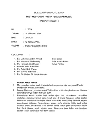 Mesyuarat Panitia Pendidikan Moral SK Saujana Utama kali pertama diadakan pada 24 Januari 2014 dengan kehadiran guru-guru. Ucapan ketua panitia menyarankan agar maklumat guru dan jadual waktu dihantar sebelum 6 Februari 2014, serta menetapkan format untuk penyediaan kertas soalan ujian dan peperiksaan. Semua kertas soalan perlu disemak dan disimpan dalam fail bank soalan untuk rujukan.