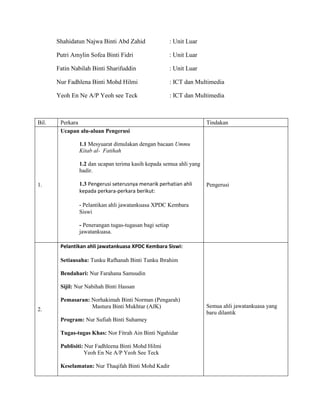 Minit mesyuarat jawatankuasa ekspedisi kembara siswi diadakan pada 8 Oktober 2013, mencatat kehadiran beberapa ahli jawatankuasa dan pelantikan jawatan. Pengerusi mengarahkan ahli untuk memikirkan tentatif program dan mencari penaja bagi program tersebut. Mesyuarat ditangguhkan pada jam 10.20 malam setelah bacaan penutup.