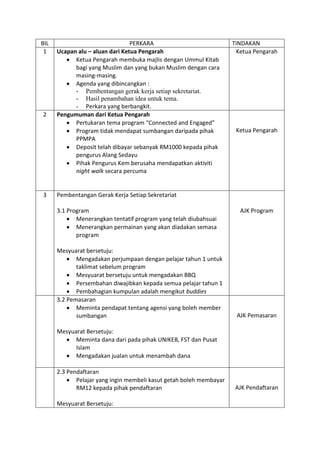 Minit mesyuarat kelab biokimia 2014/2015 membincangkan aktifiti dan persediaan program 'connected and engaged' yang termasuk pengumuman penting, pembentangan gerak kerja setiap sekretariat, dan perancangan aktiviti seperti BBQ dan taklimat untuk pelajar. Mesyuarat juga membahas tentang dana, pengangkutan, dan pengendalian media serta kebajikan peserta. Ketua pengarah mengharapkan semua jawatankuasa memberikan komitmen terhadap tugas masing-masing.