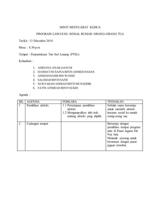 Mesyuarat program lawatan sosial ke rumah orang-orang tua diadakan dari 8 hingga 18 Disember 2014 dengan pelbagai agenda termasuk pemilihan ketua dan aktiviti. Adriana anak Ganum dipilih sebagai ketua dan aktiviti lawatan ke pusat jagaan Siti Nur Aini disetujui. Persiapan akhir termasuk pemilihan pengangkutan juga dibincangkan.