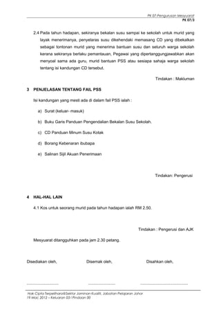 Mesyuarat Rancangan Makanan Tambahan (RMT) Bil 2/2015 diadakan pada 12 November 2015 untuk membincangkan pelaksanaan program susu sekolah dan pengurusan fail RMT dan PSS. Pengerusi, Pn. Zaleha, menekankan pentingnya pemantauan dan penyediaan maklumat yang tepat tentang bantuan yang diberikan kepada murid. Mesyuarat ditangguhkan pada jam 2.30 petang dengan beberapa tindakan yang diambil untuk pengurusan RMT yang lebih baik pada tahun hadapan.